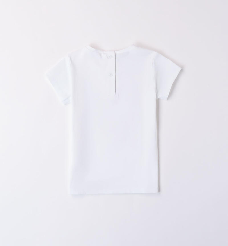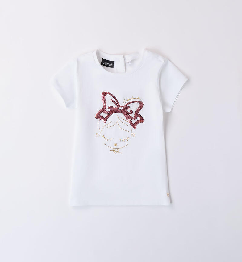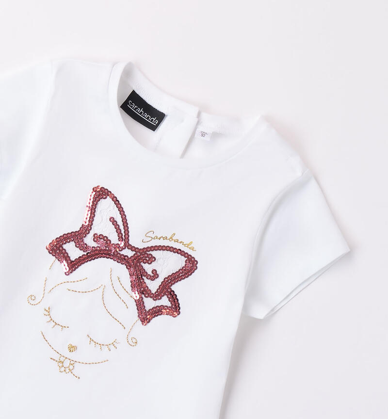 T-shirt per bambina Sarabanda realizzata in jersey stretch di cotone con ricamo lurex e ricamo di paillettes. Scelta perfetta per le giornate estive