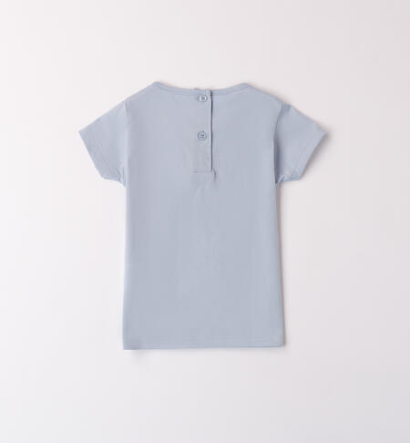 T-Shirt per bambina iDO da 9 mesi a 8 anni in jersey 100% cotone. Il modello presenta apertura sul retro con bottoni, fantasia tinta unita e stampa frontale bambina con strass e applicazione cuore