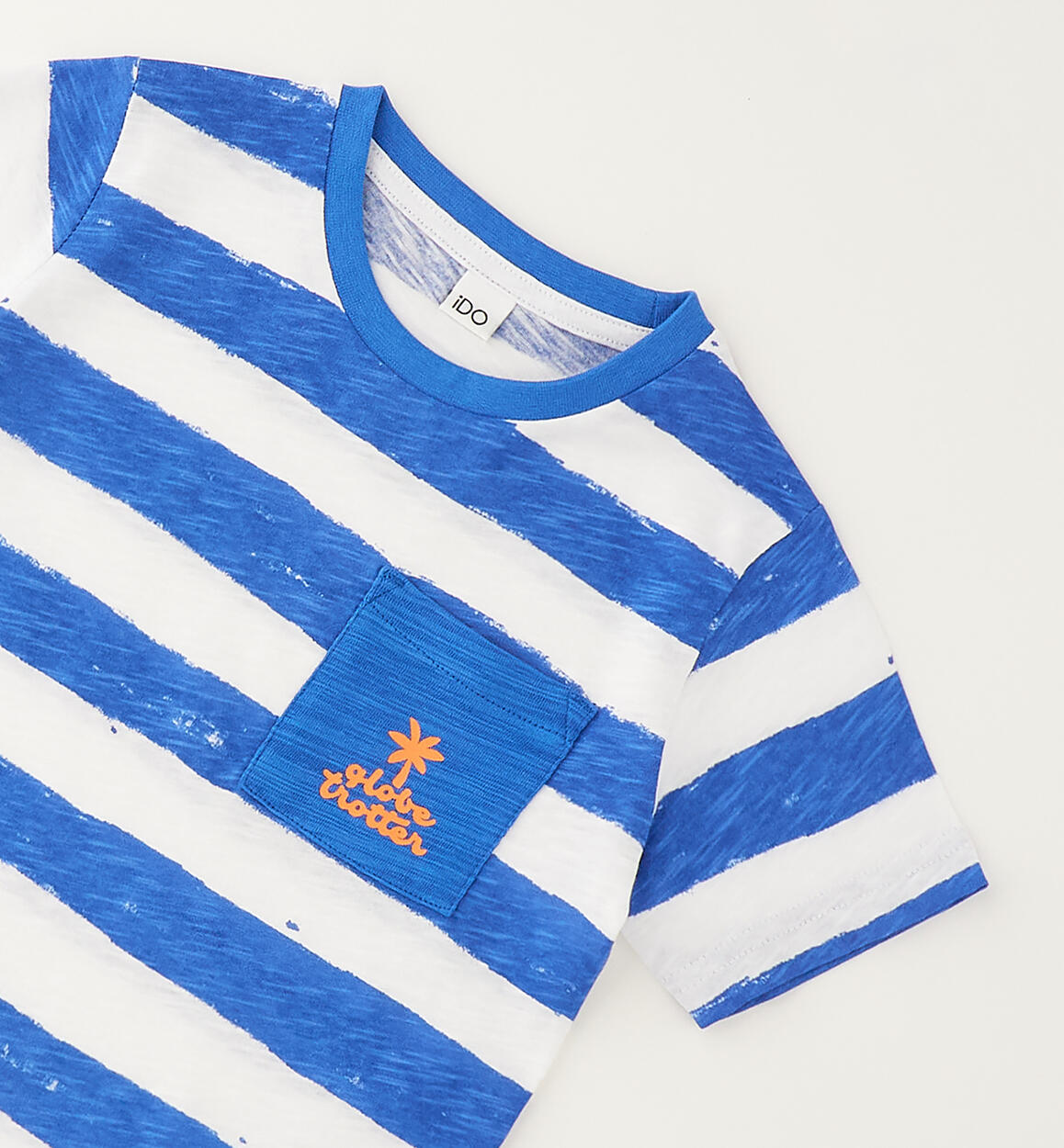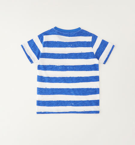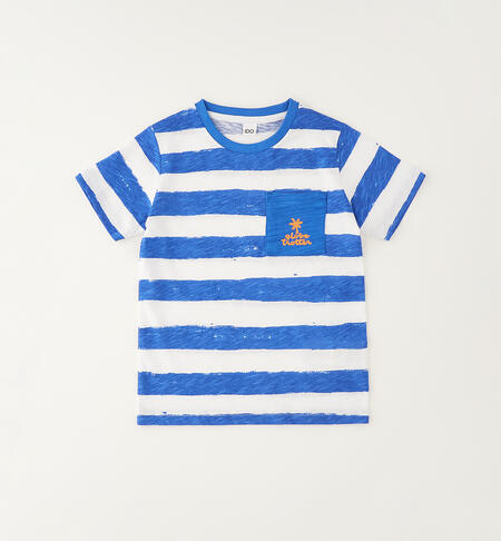 T-shirt per bambino iDO realizzata in jersey 100% cotone con fantasia rigata. Taschino davanti con stampa.