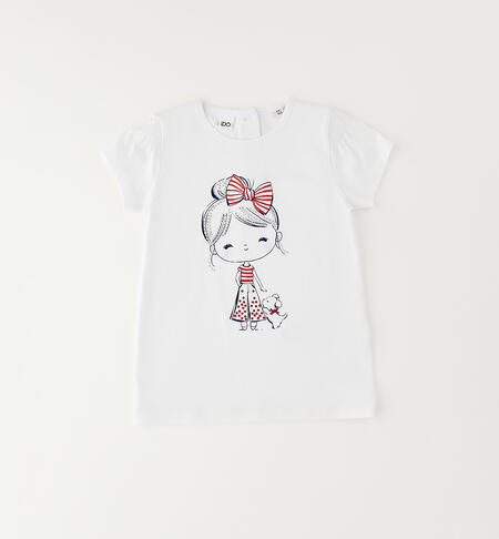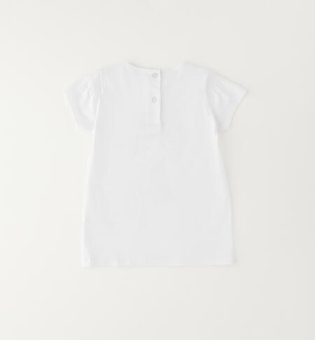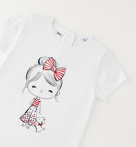 T-shirt per bambina iDO realizzata in jersey 100% cotone con dolce stampa illuminata da strass. Particolare lavorazione sulle spalle.