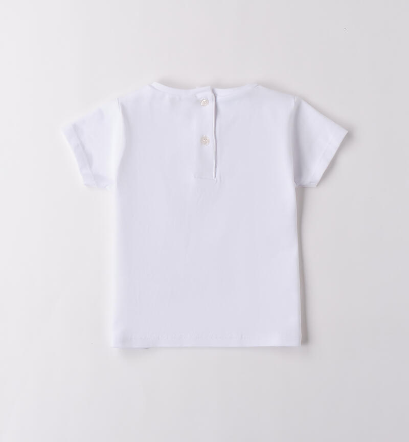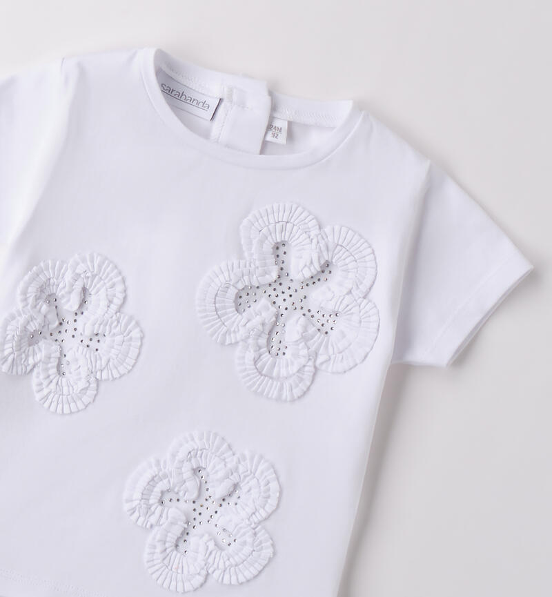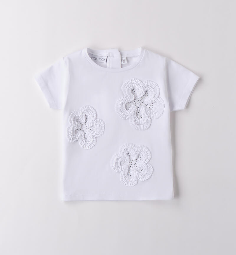 T-shirt Sarabanda per bambina da 9 mesi a 8 anni realizzata in jersey stertch di cotone. Il modello presenta apertura sul retro con bottoni, fantasia tinta unita e fiori in applicazione con strass.