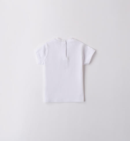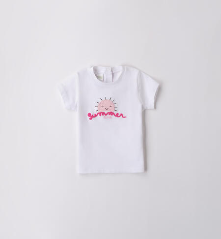 T-shirt per bimba iDO 1-24 mesi in jersey 100% cotone. Il modello presenta apertura sul retro con bottoni a pressione per agevolare il cambio e la vestizione, fantasia tinta unita con ricamo frontale