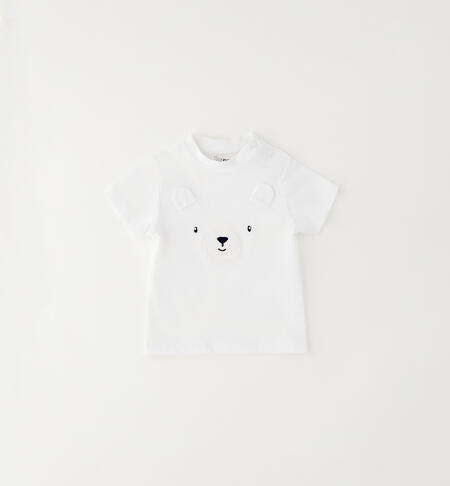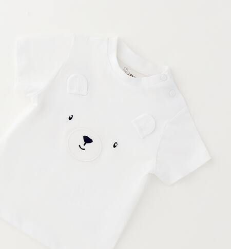 T-shirt iDO per bimbo da 1 a 24 mesi realizzata in jersey 100% cotone con ricami e applicazione orecchie. Apertura sulla spalla con bottoni a pressione.