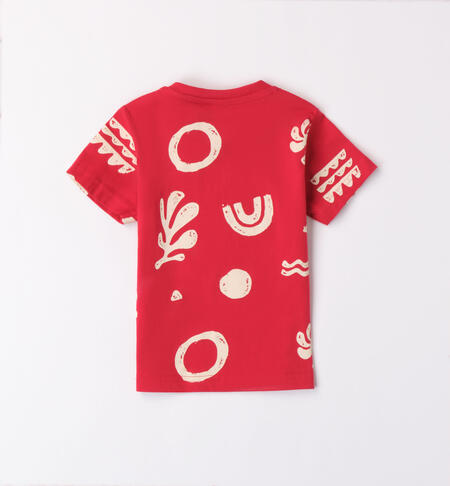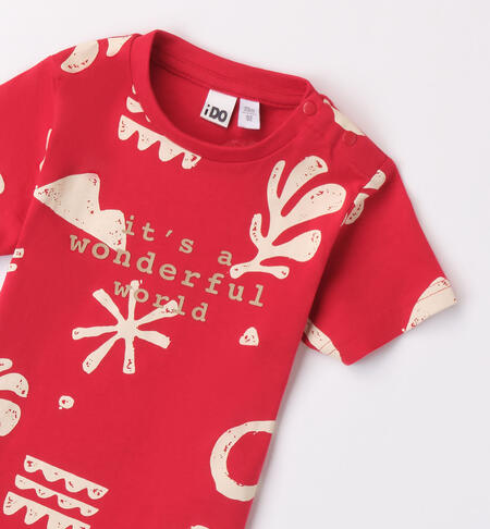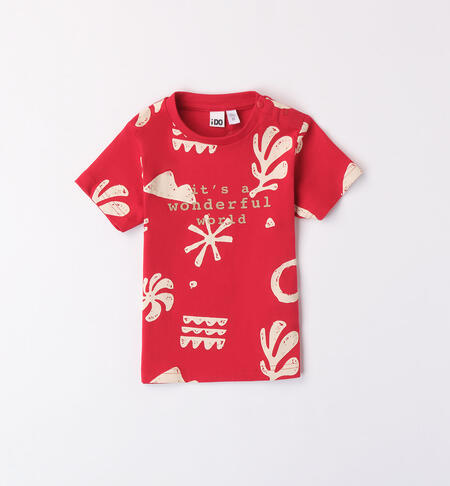 T-shirt iDO per bambino realizzata in jersey 100% cotone con fantasia all over e stampa gommata. Apertura sulla spalla con bottoni automatici fino alla taglia 3 anni.