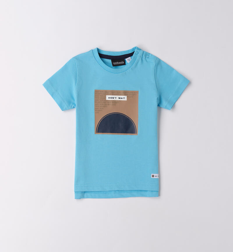 T-Shirt per bambino Sarabanda da 9 mesi a 8 anni in jersey 100% cotone. Il modello presenta apertura sulla spalla con bottoni a pressione fino alla taglia 3 anni per agevolare il cambio e la vestizione, fantasia tinta unita e stampa frontale.