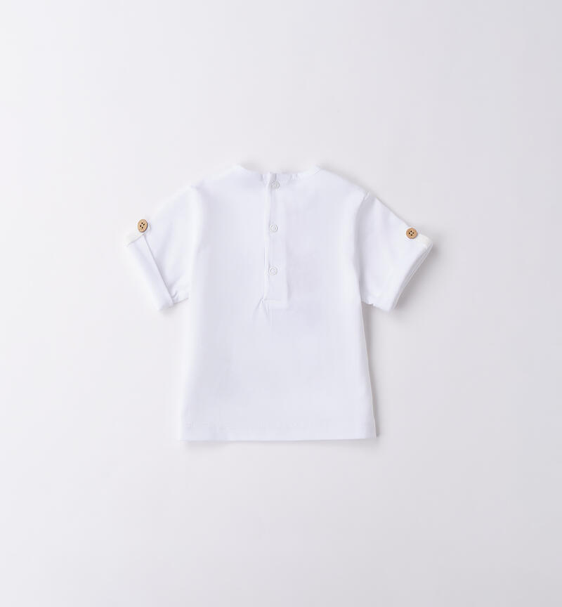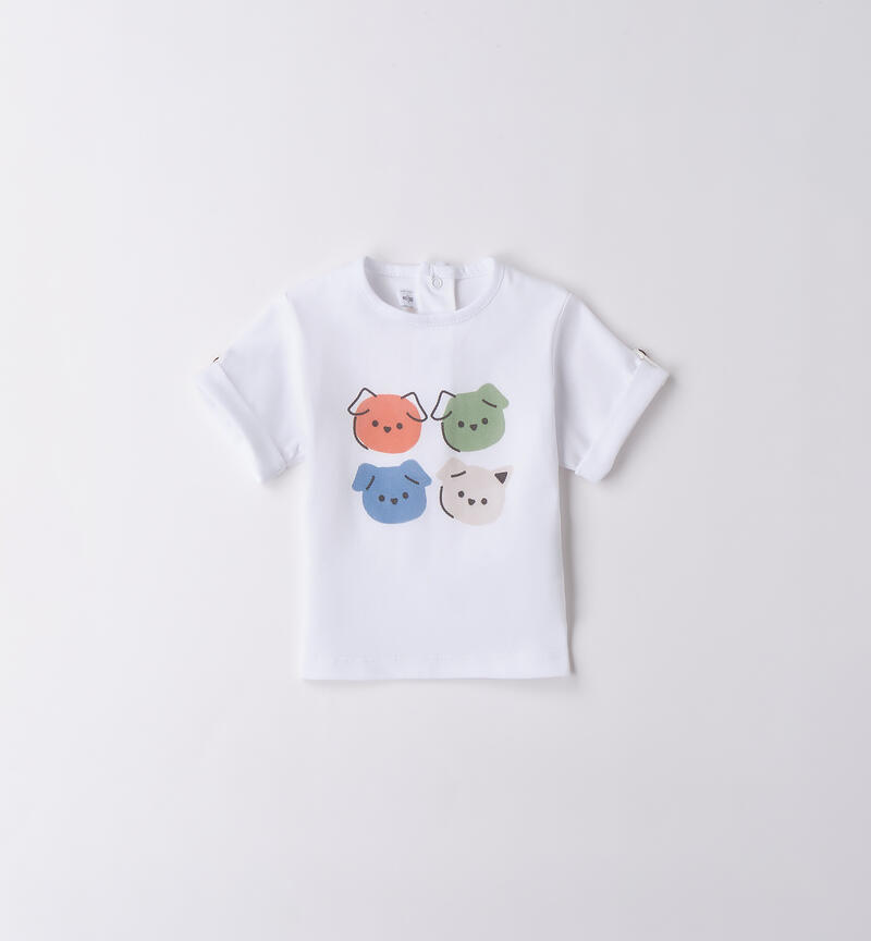 T-shirt per bimbo Minibanda 1-24 mesi realizzata in jersey 100% cotone. Il modello presenta apertura sul retro con bottoni a pressione per agevolare il cambio e la vestibilitร . La t-shirt ha un stampa frontale con animali ed รจ in fantasia tinta unita.