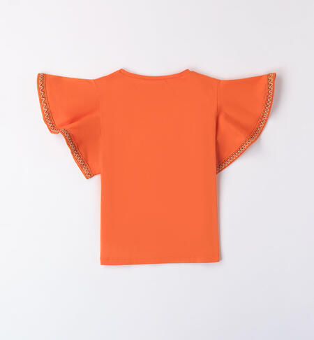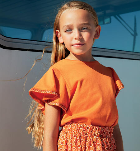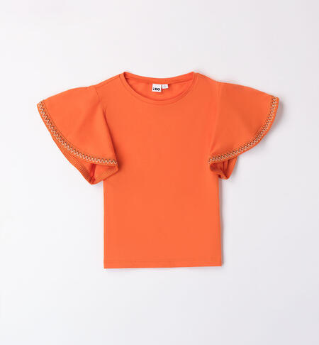 T-shirt arancio per ragazza iDO realizzata in jersey 100% cotone. Il modello ha ampie maniche con ricamo sul fondo .