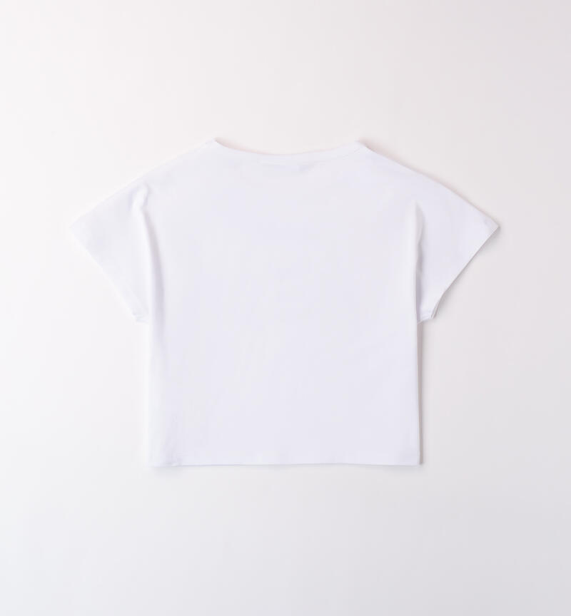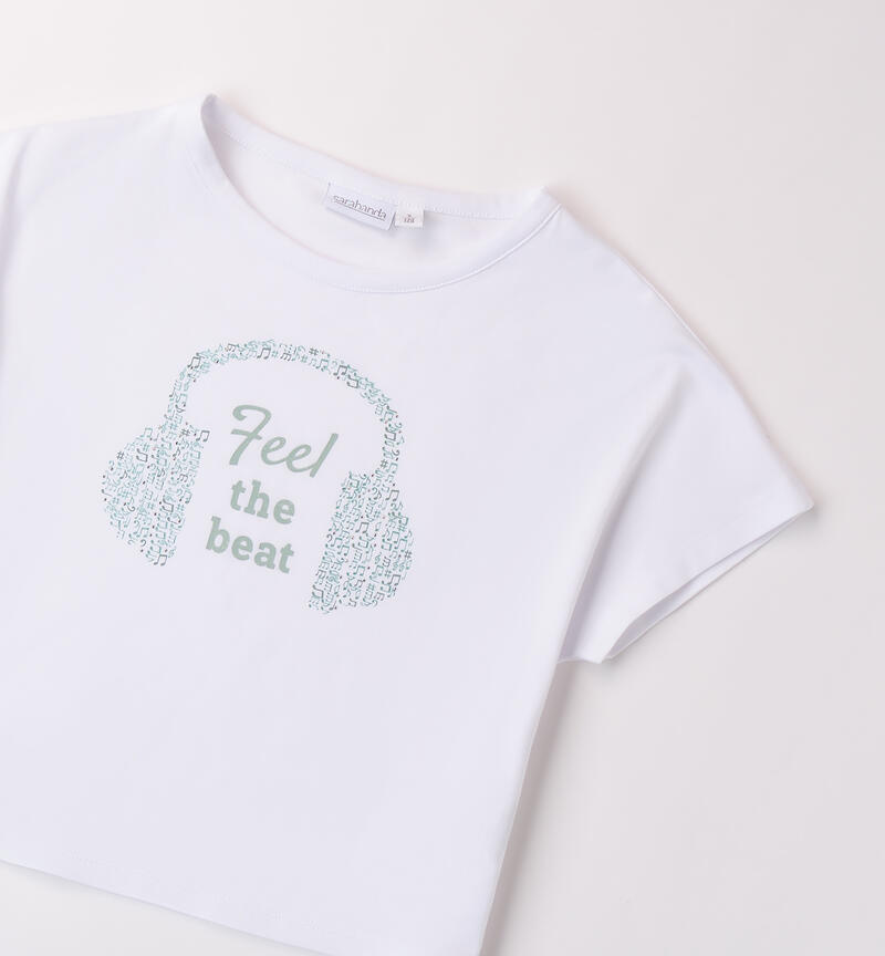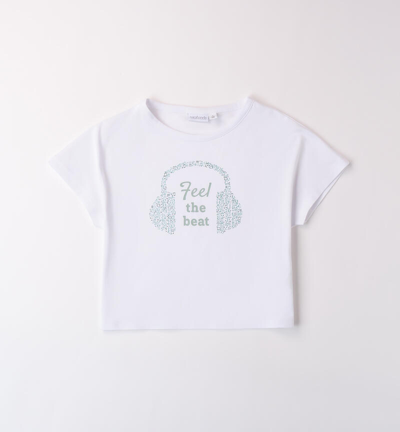 T-shirt Sarabanda per ragazza da 8 a 16 anni realizzata in jersey stretch di cotone. Il modello è in fantasia tinta unita con scritte frontali.