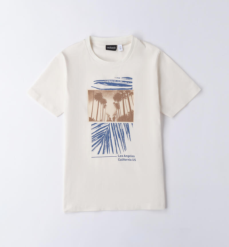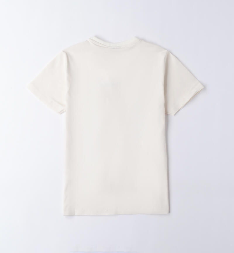 T-Shirt per ragazzo Sarabanda realizzata in jersey stretch di cotone. Il modello è in fantasia tinta unita con stampa frontale.