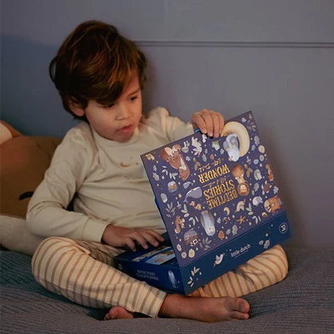 La torcia con proiettore ha una robusta impugnatura in legno e funziona a batterie, quindi puรฒ essere portata ovunque. Dopo la storia, puoi riporre facilmente la torcia e tutti gli accessori nella splendida scatola portaoggetti. Perfetta per i bambini che amano scoprire e vivere le storie.