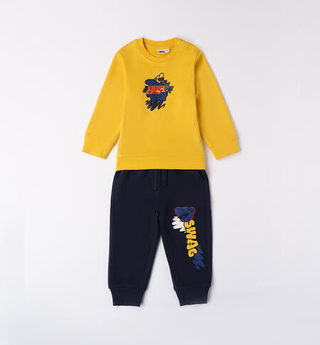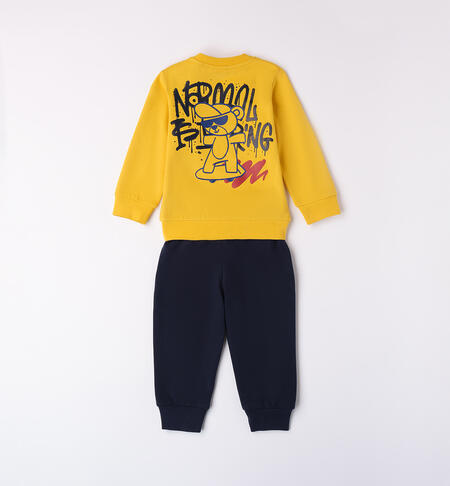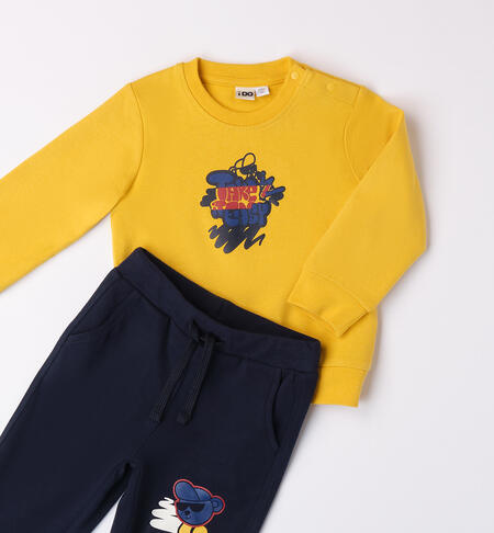 Tuta per bambino iDO in jersey pesante, felpato internamente. La felpa presenta apertura sulla spalla con bottoni a pressione fino alla taglia 3 anni, fantasia tinta unita con stampa davanti e dietro. Il pantalone ha vita elasticizzata con coulisse tono su tono, polsini sul fondo e stampa sulla gamba.