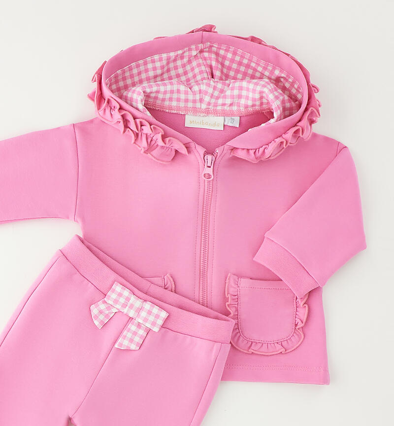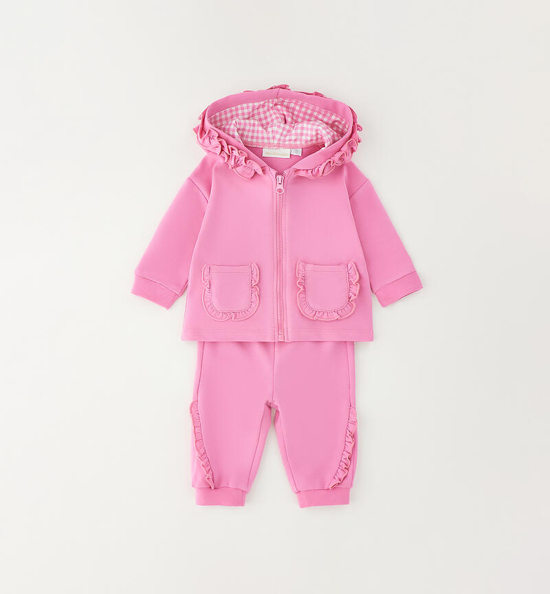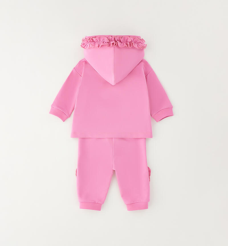 Tuta jogging per neonata Minibanda in felpa stretch di cotone. Giacchetto con apertura tramite zip, cappuccio foderato in tessuto increspato e tasche davanti con ruches. Pantalone con elastico in vita e coulisse, ruches sul fondo gamba.