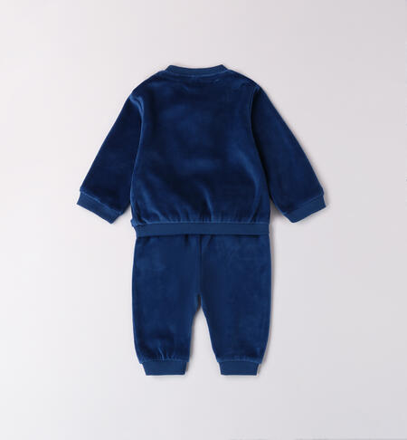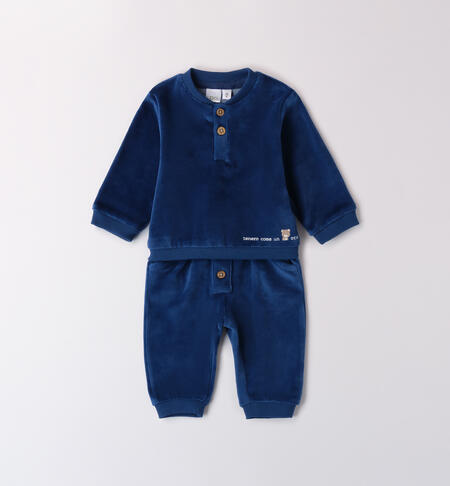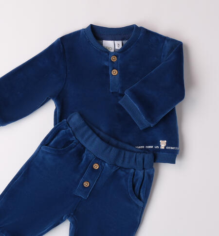Completo neonato due pezzi iDO 1-24 mesi realizzato in ciniglia di cotone. Il modello è composto da felpa e pantalone. La felpa è realizzata in tinta unita con polsini sul fondo e sulla maniche. Il pantalone ha la vita elasticizzata con bottoni, tasche laterali e polsini sul fondo gamba.