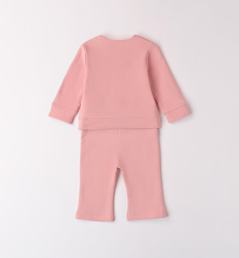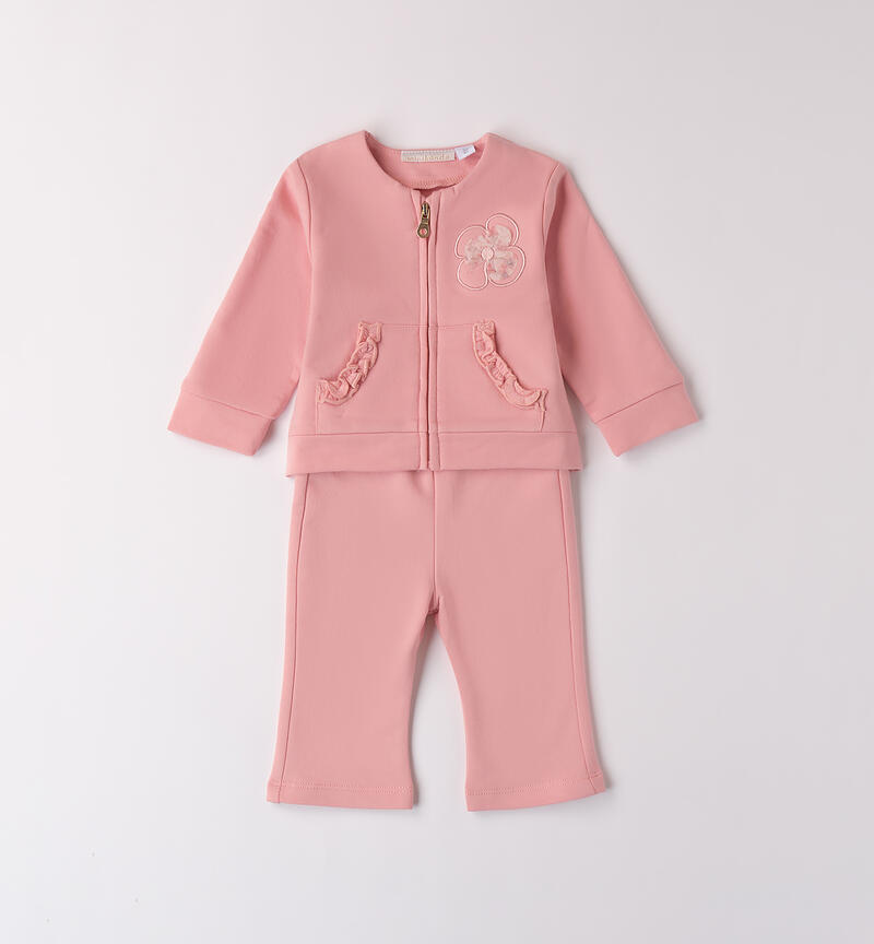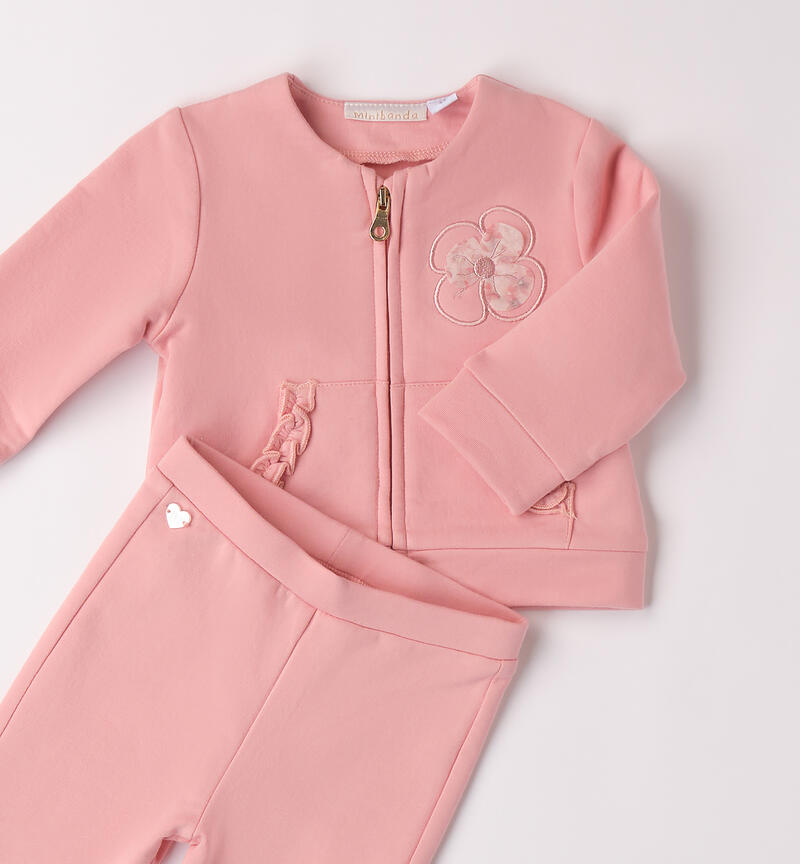 Completo bimba due pezzi Minibanda realizzato in cotone stretch felpato. La felpa presenta apertura frontale con zip ed è arricchita da ruches, ricamo fiori e tasche. Il pantalone a zampa, ha la vita elasticizzata.