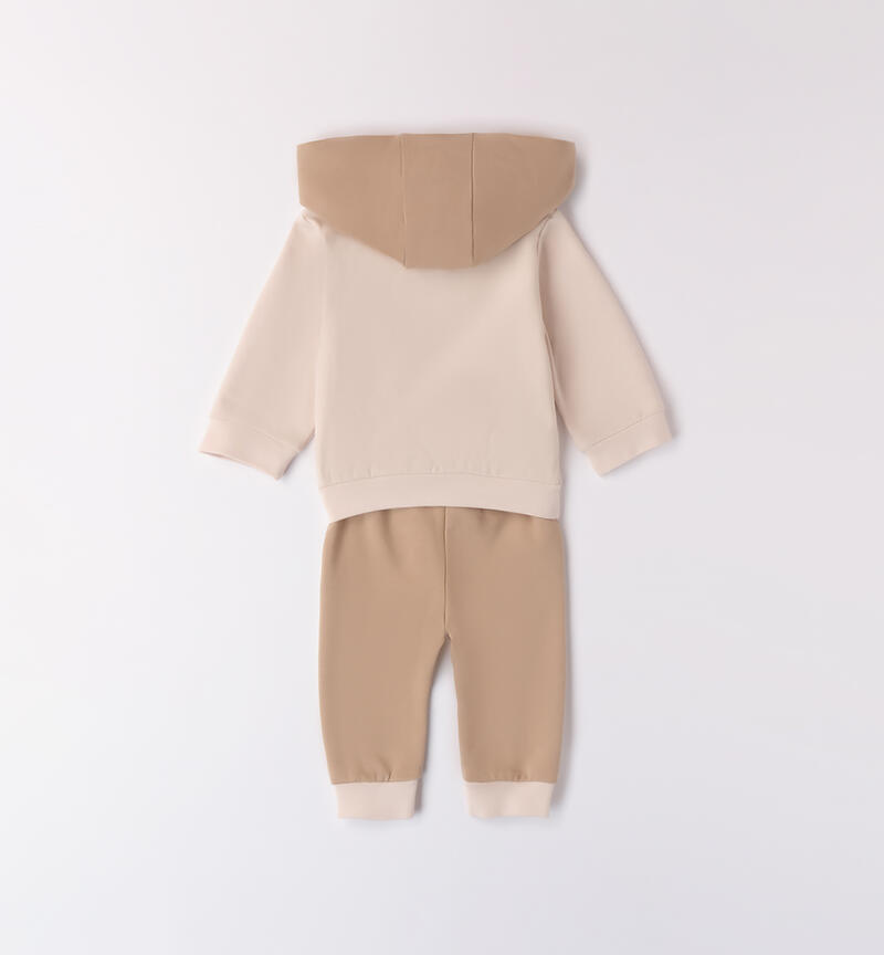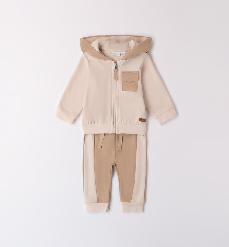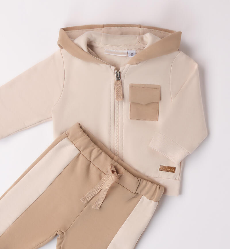 Completo bimbo neonato due pezzi Minibanda 1-24 mesi realizzato in cotone felpato internamente. Pesantezza invernale. Il modello presenta apertura frontale con zip. La felpa รจ bicolor con tasca davanti e cappuccio. Il pantalone ha la vita elasticizzata con coulisse e polsini sul fondo gamba.