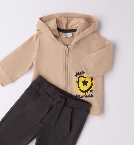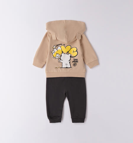 Tuta neonato iDO con cappuccio in felpa 100% cotone. La felpa presenta apertura con zip, comodo cappuccio con inserto orecchie. I pantaloni hanno vita elasticizzata con coulisse, tasca a marsupio.