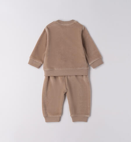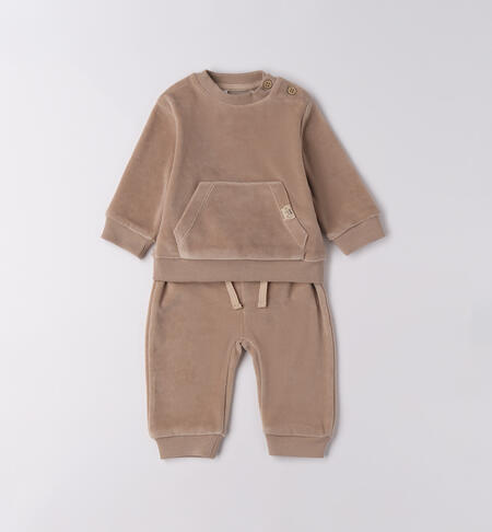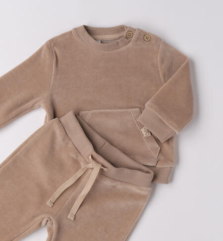 Completo bimbo neonato due pezzi iDO 1-24 mesi realizzato in ciniglia. Il modello presenta apertura sulla spalla con bottoni per agevolare il cambio e la vestizione. La felpa รจ realizzata in tinta unita con tasca a marsupio. Il pantalone ha la vita elasticizzata e polsini sul fondo gamba.
