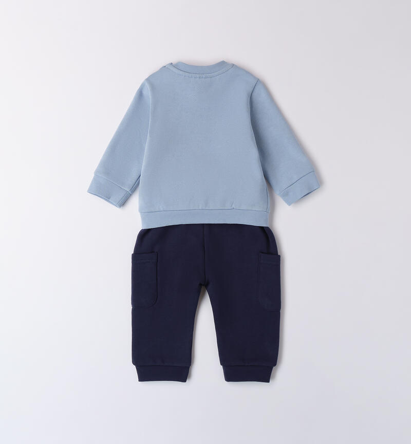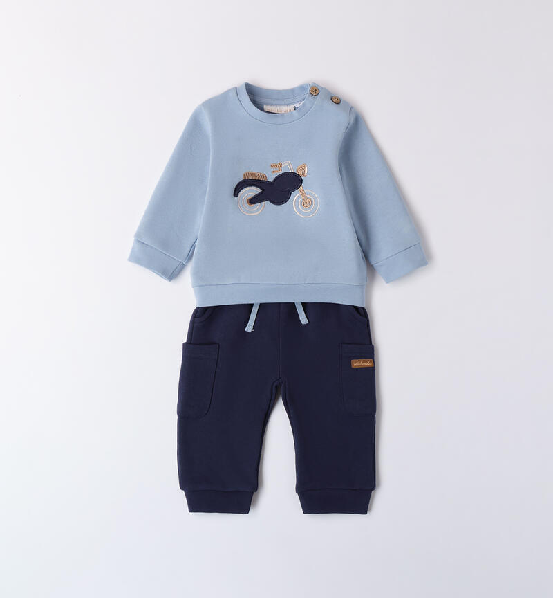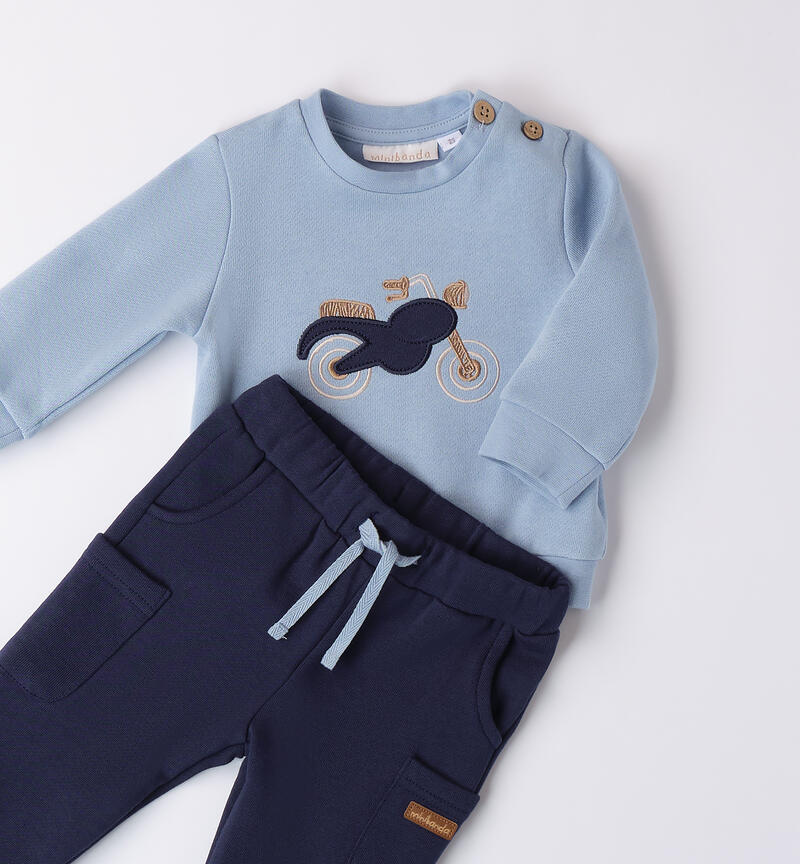 Completo bimbo due pezzi Minibanda 1-24 mesi realizzato in cotone felpato internamente. Pesantezza invernale. Il modello presenta apertura sulla spalla con bottoni. La felpa รจ realizzata in tinta unita con applicazione frontale e ricamo. Il pantalone ha la vita elasticizzata con coulisse, i polsini sul fondo gamba e tasconi laterali.