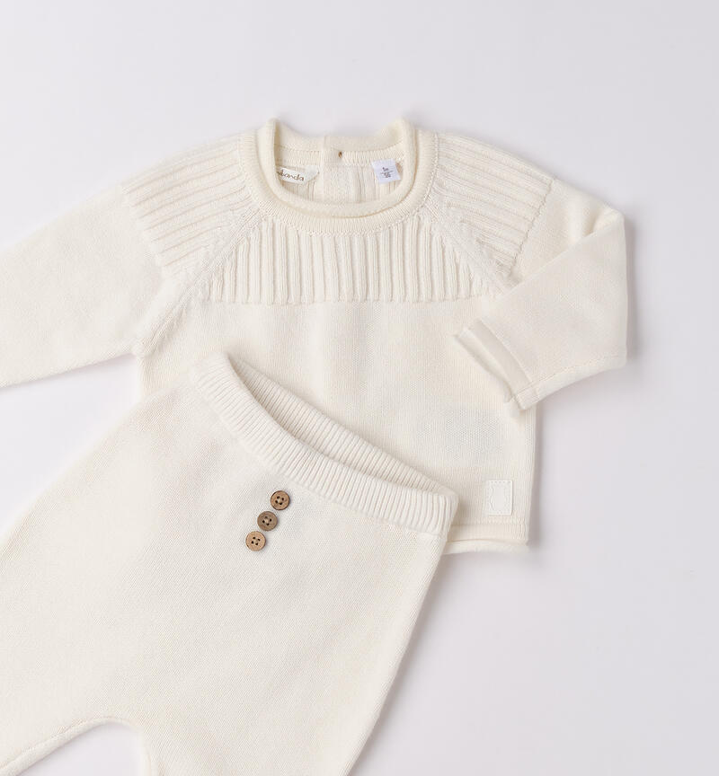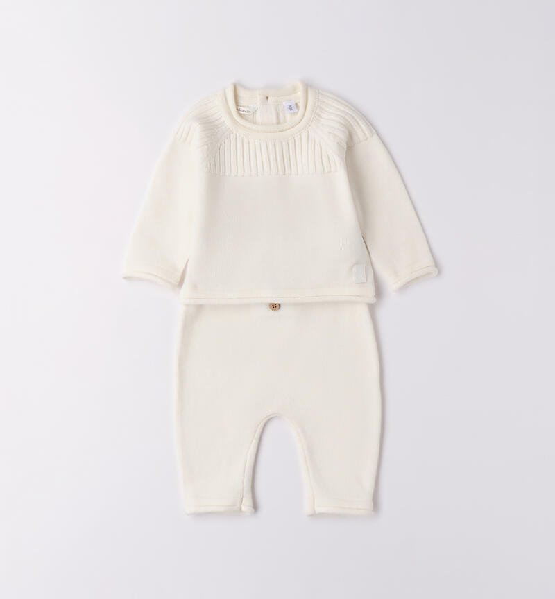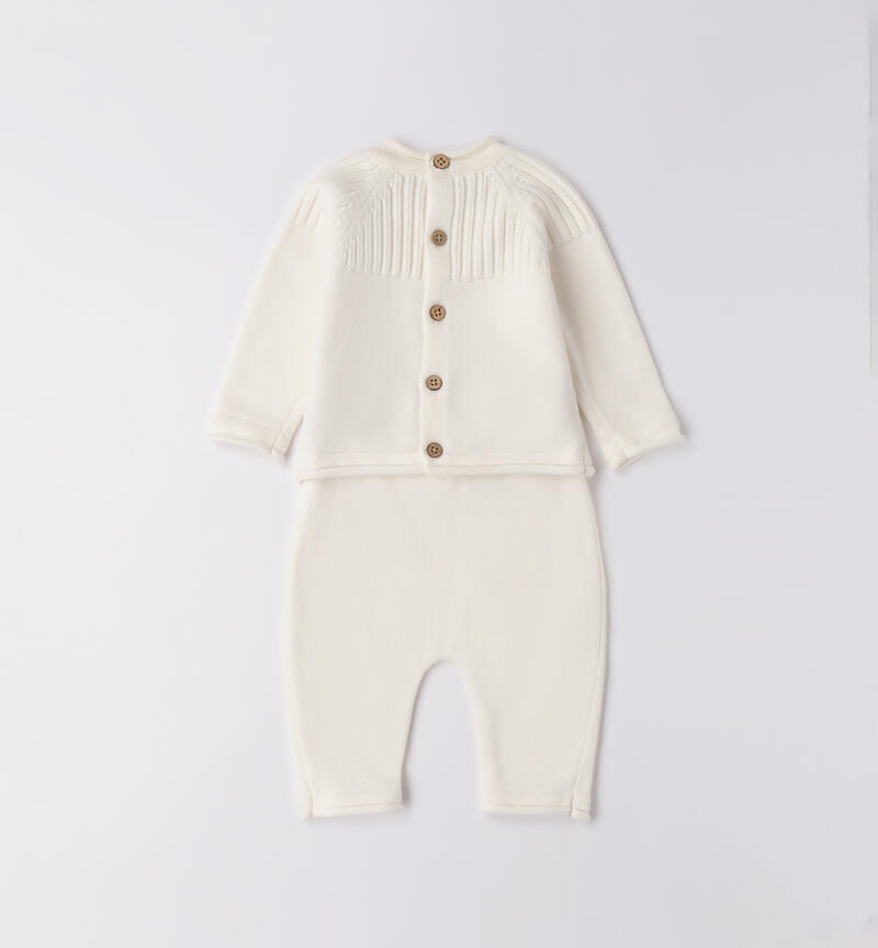 Completo bimbo due pezzi Minibanda 0-18 mesi realizzato in tricot. Maglia con apertura dietro tramite bottoni. Manica raglan