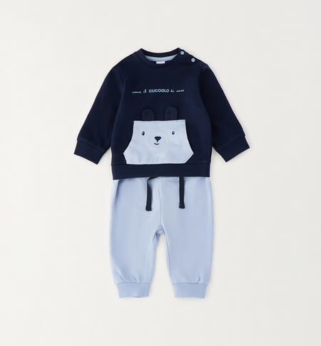 Tuta in felpa leggera iDO per bimbo da 1 a 24 mesi realizzata in felpa 100% cotone. La felpina ha l’apertura sulla spalla con bottoni a pressione e davanti รจ arricchita da stampa, tasca a marsupio con ricamo ed orecchie in applicazione. Pantalone con elastico in vita e coulisse, polsino sul fondo gamba.