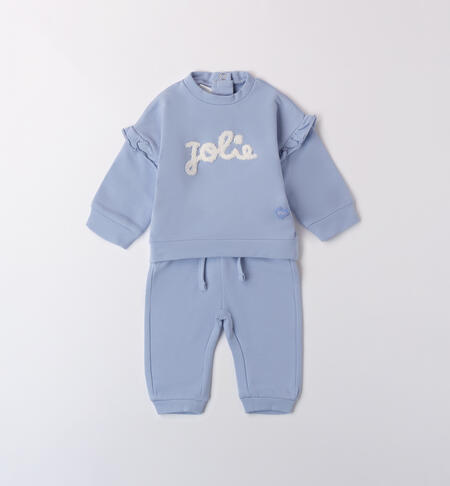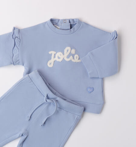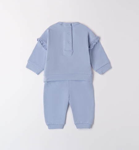Tuta neonata iDO realizzata in tessuto di felpa stretch di cotone, pesantezza invernale. Il modello è composto da felpa e pantalone. La felpa presenta apertura sul retro con bottoni a pressione per agevolare il cambio e la vestizione e ruches in arricchimento. Fantasia tinta unita con ricamo davanti. Il pantalone ha vita elasticizzata con coulisse e polsini sul fondo gamba.