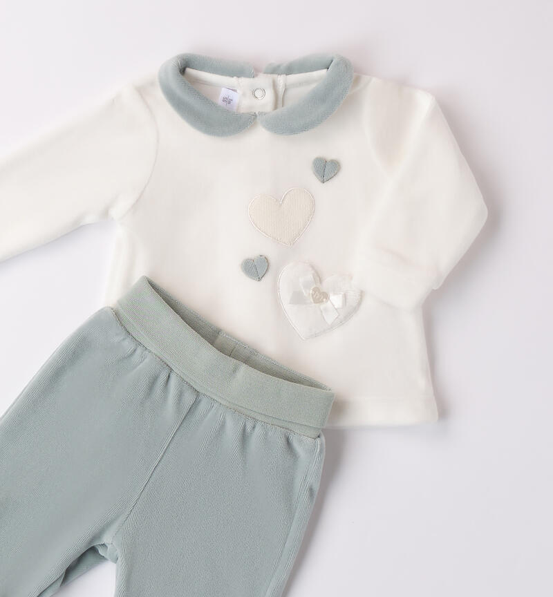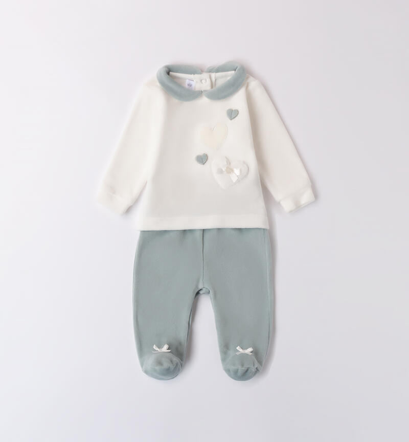 Tutina per neonata Minibanda in ciniglia. La maglietta ha l’apertura sul retro con bottoni a pressione per agevolare il cambio e la vestizione e davanti รจ arricchita da cuori ricamati e in applicazione. La ghettina รจ impreziosita da piccoli fiocchi sui piedini.