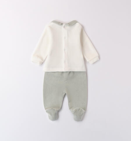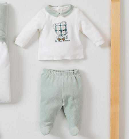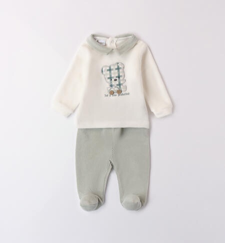 Tutina per neonato iDO 0-12 mesi in ciniglia. La maglia presenta apertura sul retro con bottoni a pressione per agevolare il cambio e la vestizione e davanti รจ arricchita da orsetto in applicazione. La ghettina รจ in ciniglia effetto velluto