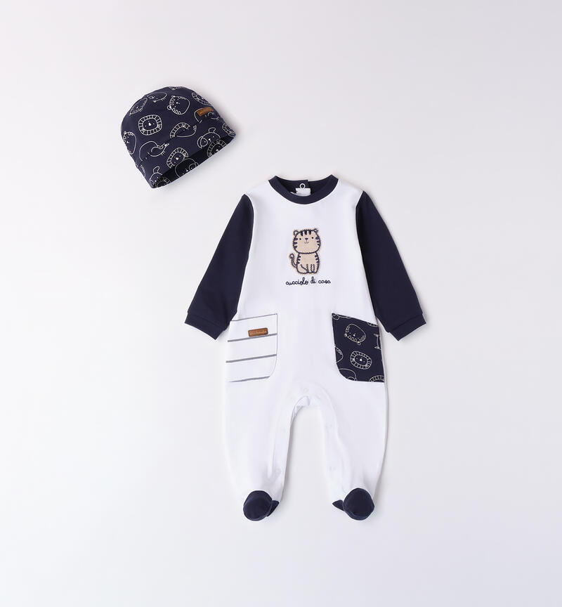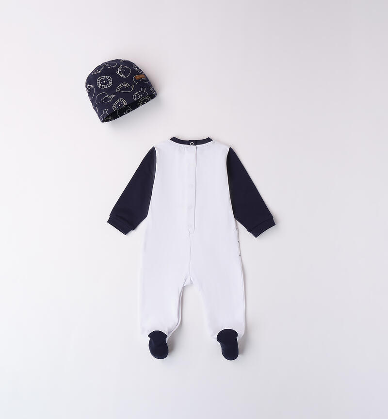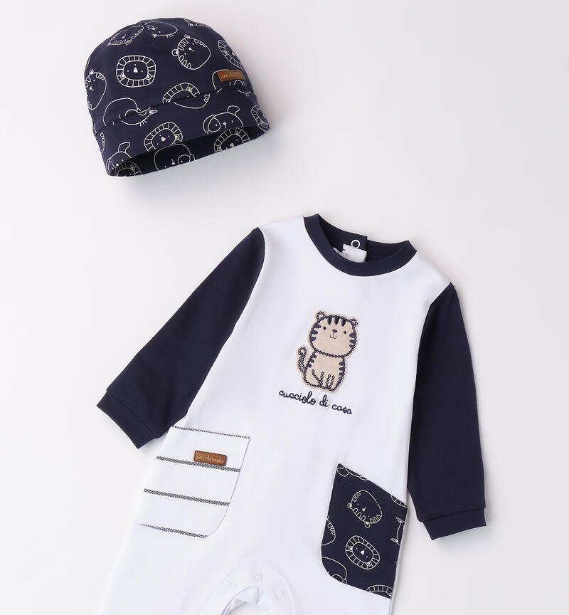 Tutina neonato Minibanda 0-18 mesi realizzata in jersey stretch di cotone. Il modello presenta apertura sul retro e nel sottogamba con bottoni a pressione per agevolare il cambio e la vestizione. La tutina รจ in fantasia tinta unita con maniche a contrasto e stampa frontale. Grazioso cappellino in abbinamento.