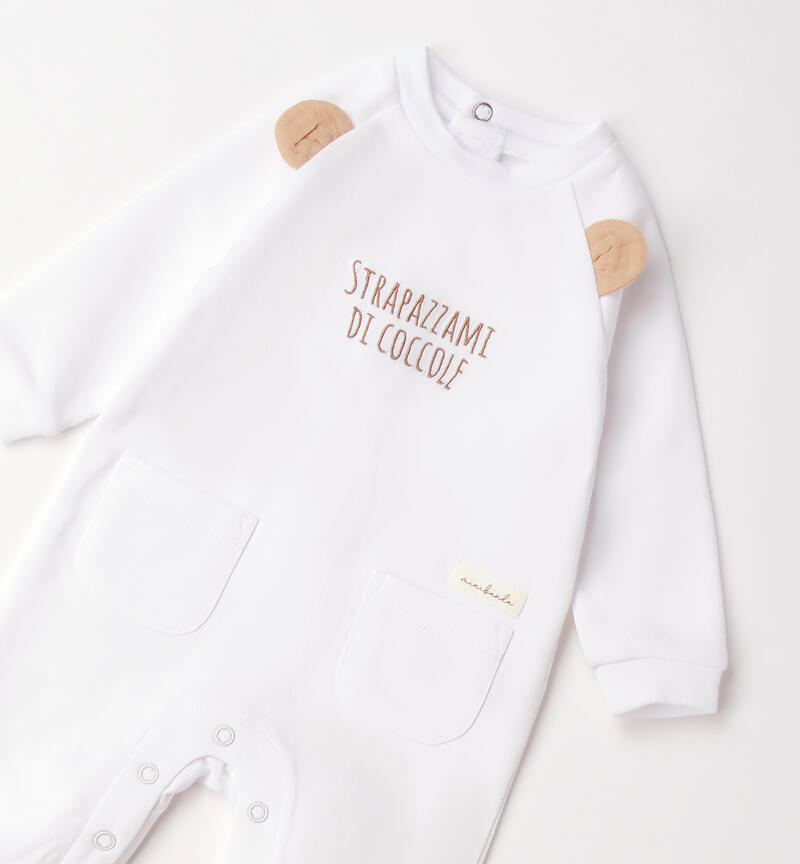 Tutina intera con piede per neonato Minibanda realizzata in felpa 100% cotone. Modello arricchito da taschine davanti e ricamo. Applicazione simpatiche orecchie e piedini a contrasto colore. Apertura dietro e nell’interno gamba per agevolare il cambio e la vestizione.