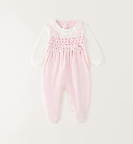 Tutina rosa per neonata iDO da 0 a 18 mesi realizzata in jersey stretch di cotone. Modello finta salopette con colletto e applicazione fiore. Apertura sul retro e nel sottogamba con bottoni a pressione per agevolare il cambio e la vestizione