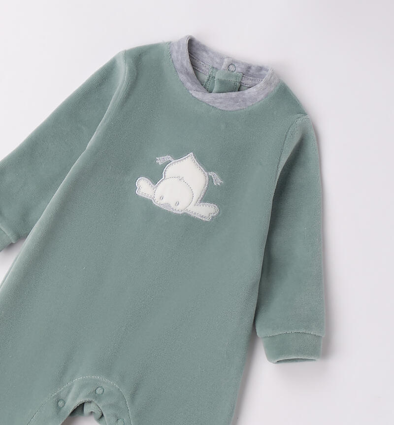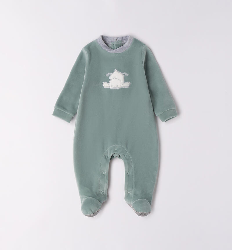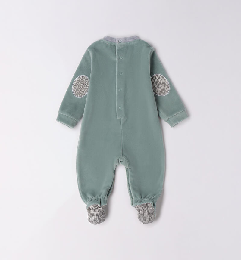 Tutina neonato Minibanda 0-18 mesi realizzata in ciniglia. Il modello presenta apertura sul retro e nel sottogamba con bottoni a pressione per agevolare il cambio e la vestizione. La tutina รจ arricchita da toppe sulle maniche, e ricamo applicazione davanti.