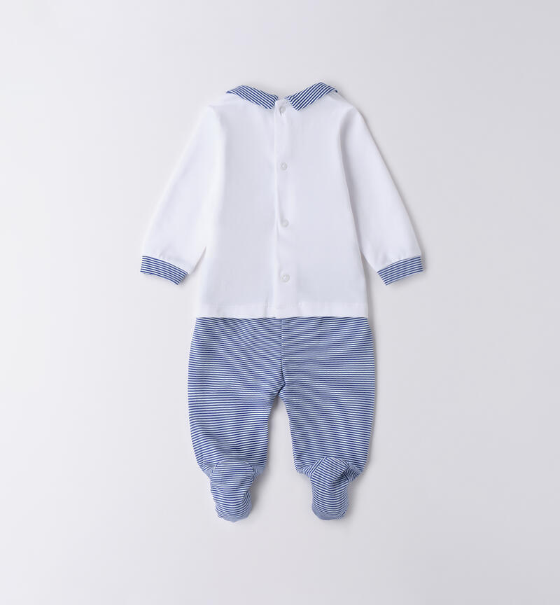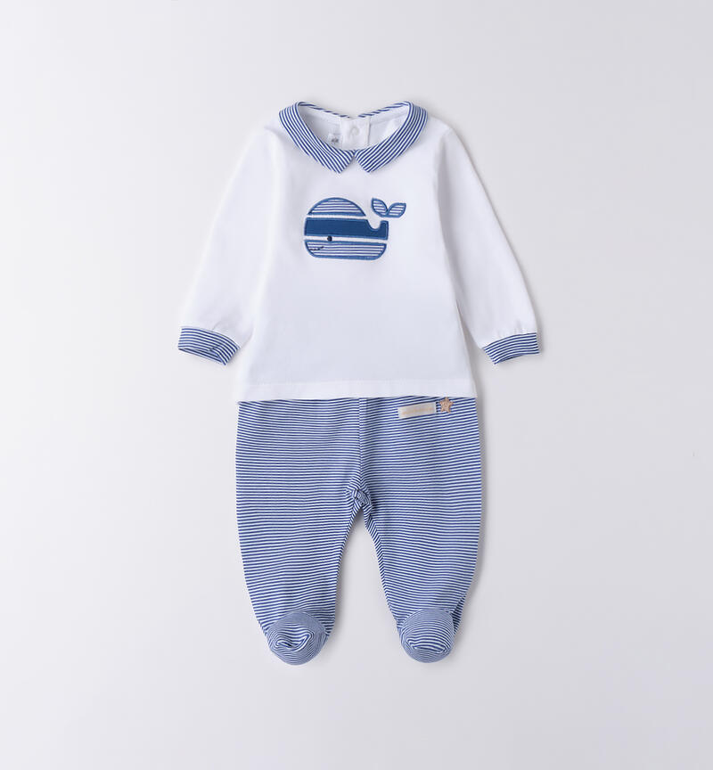 Tutina neonato Minibanda 0-18 mesi realizzata in jersey stretch di cotone. Il modello presenta apertura sul retro con bottoni a pressione per agevolare il cambio e la vestizione. La tutina รจ in fantasia bicolor: la maglietta รจ in tinta unita, tema balena e la ghettina รจ rigata.