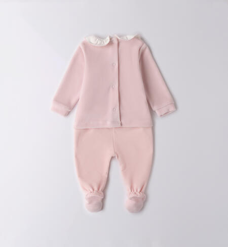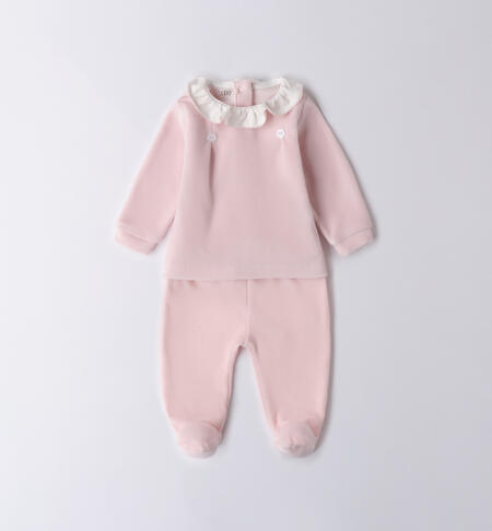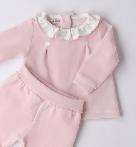Tutina due pezzi con piede per neonata iDO in ciniglia. L’articolo presenta l’apertura sul retro con bottoni a pressione per agevolare il cambio e la vestizione, fantasia tinta unita con collletto a contrasto. I pantaloni sono elasticizzati ed in fantasia tinta unita.