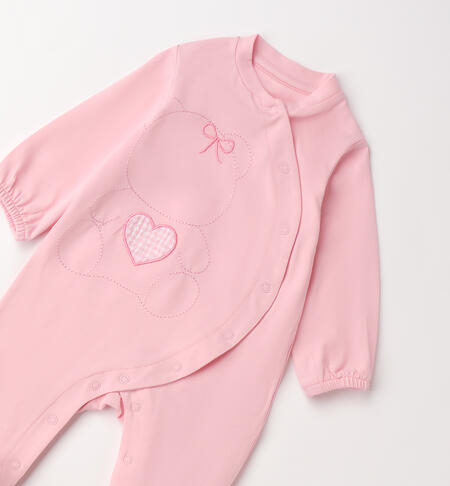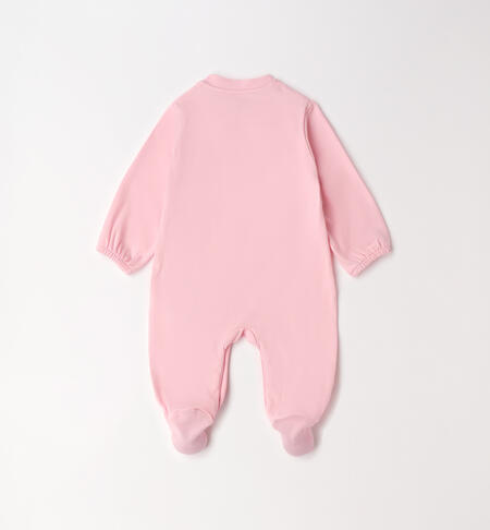 Tutina rosa per neonata iDO da 0 a 18 mesi realizzata in jersey stretch di cotone arricchita da ricami e applicazione ricamo. Il modello presenta apertura davanti e nel sottogamba con bottoni a pressione per agevolare il cambio e la vestizione.