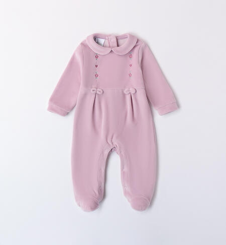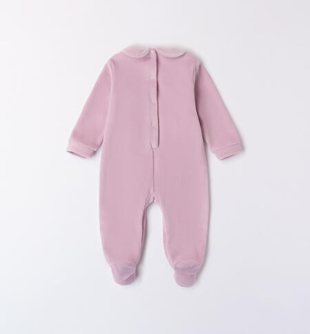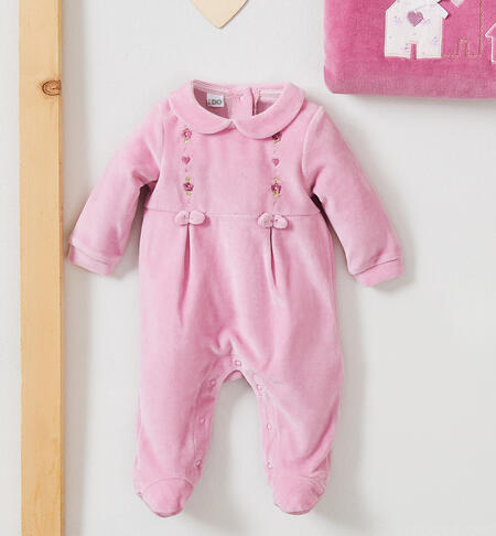 Tutina per neonata iDO 0-18 mesi in ciniglia. Il modello presenta apertura sul retro e nel sottogamba con bottoni a pressione per agevolare il cambio e la vestizione. La tutina รจ realizzata in fantasia tinta unita con piccoli ricami