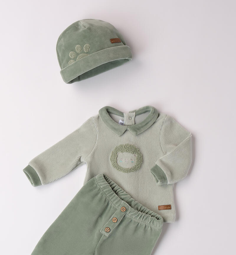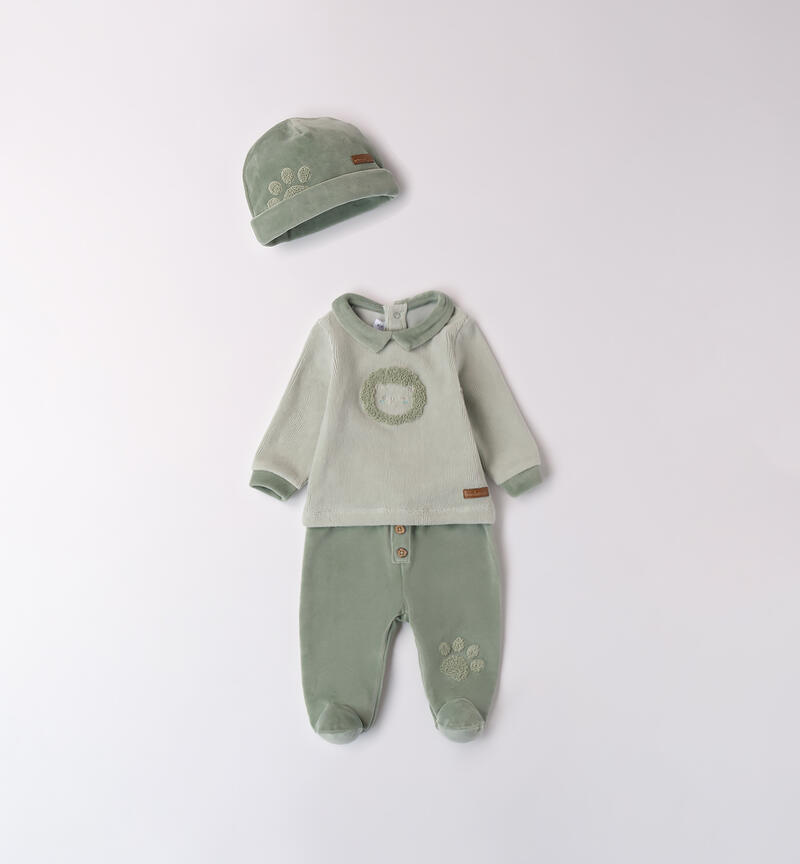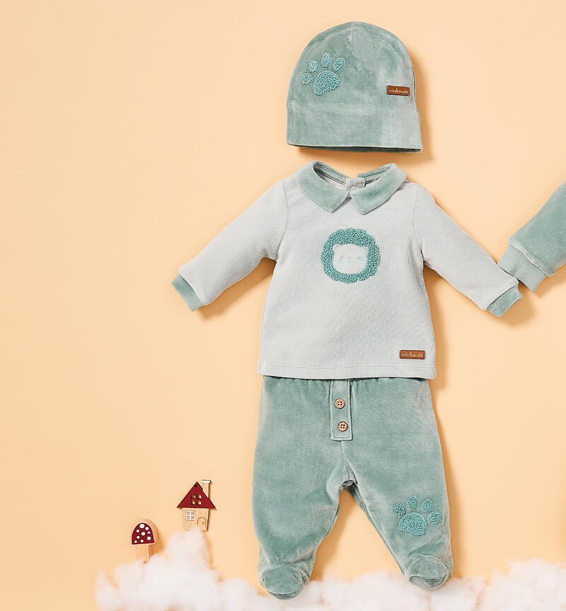 Tutina per neonato Minibanda 0-18 mesi in ciniglia. La maglietta è realizzata in ciniglia effetto velluto ed è arricchita da ricamo spugna. La ghettina è impreziosita da ricamo spugna a zampetta. In abbinamento il cappellino modello cuffia.