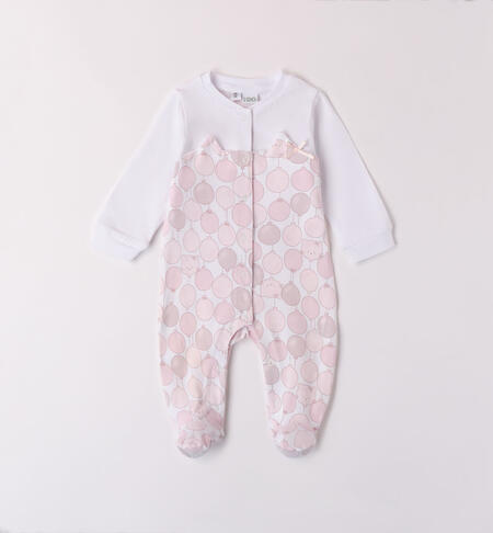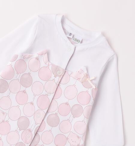 Tutina intera iDO per neonata realizzata in jersey stretch di cotone. Il modello presenta apertura frontale e nell’interno cosce con bottoni a pressione per agevolare il cambio e la vestizione. La tutina neonata รจ realizzata in fantasia allover.