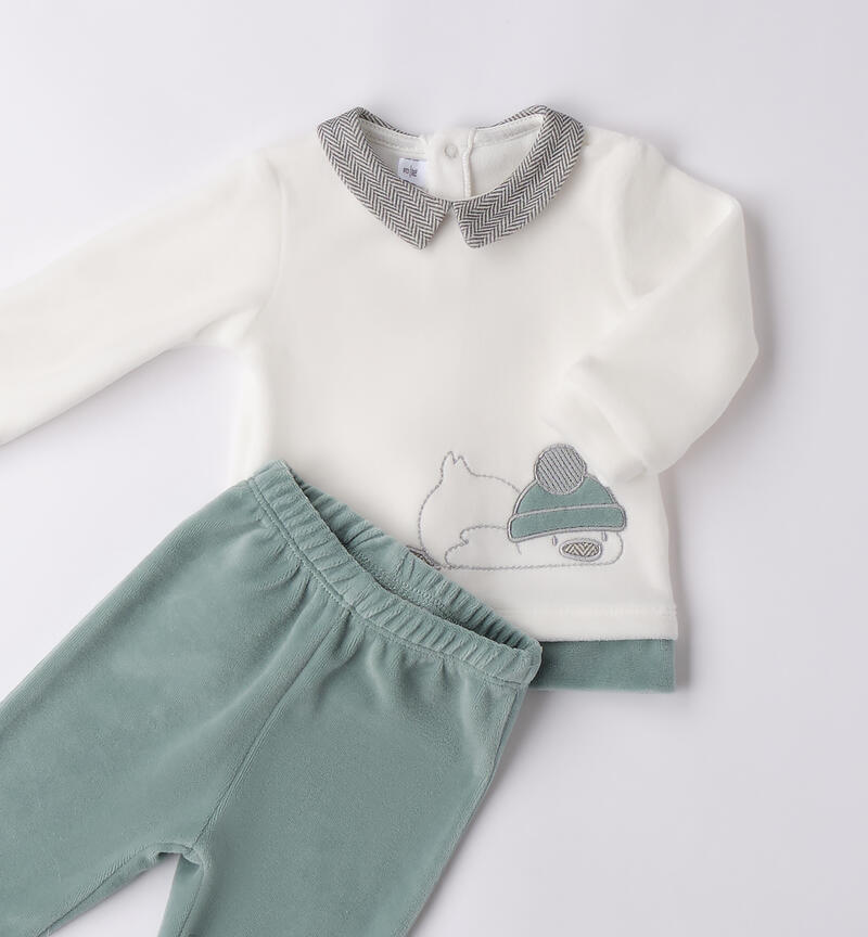 Tutina due pezzi per neonato Minibanda 0-18 mesi in ciniglia. Il modello presenta apertura sul retro con bottoni a pressione per agevolare il cambio e la vestizione. Ghettina con elastico in vita.