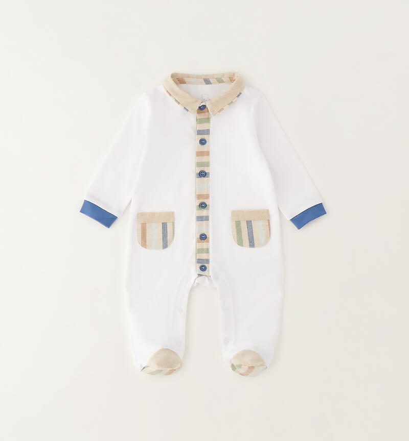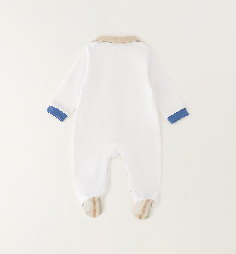 Tutina intera con piede per neonato Minibanda realizzata in jersey stretch di cotone con con dettagli a righe. Apertura davanti e nel sottogamba con bottoni.