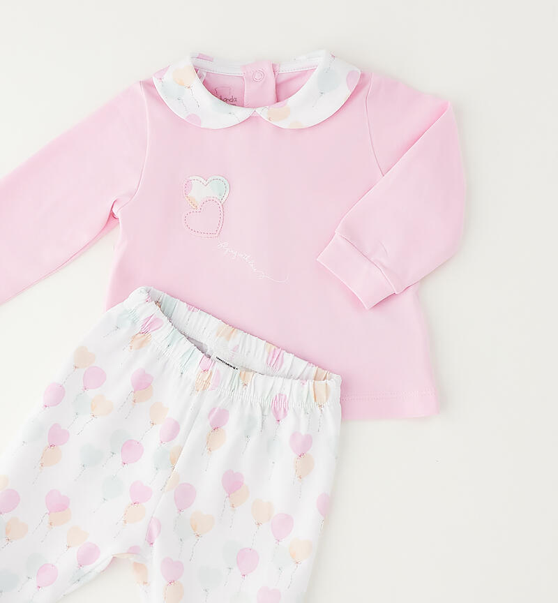 Tutina due pezzi con piede per neonata Minibanda realizzata in jersey stretch di cotone. Maglietta con apertura dietro con bottoni a pressione. Davanti รจ arricchita da piccola stampa e applicazioni ricamo. Colletto con fantasia all over in abbinamento al pantalone. La ghettina ha stampa all over con stampa palloncini a cuore.