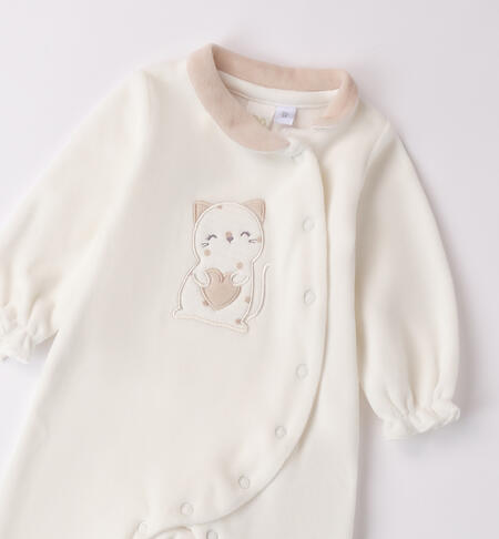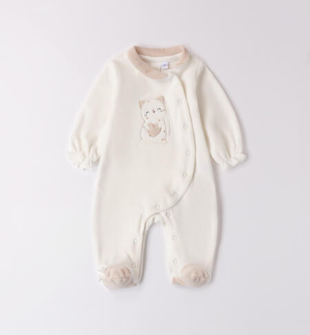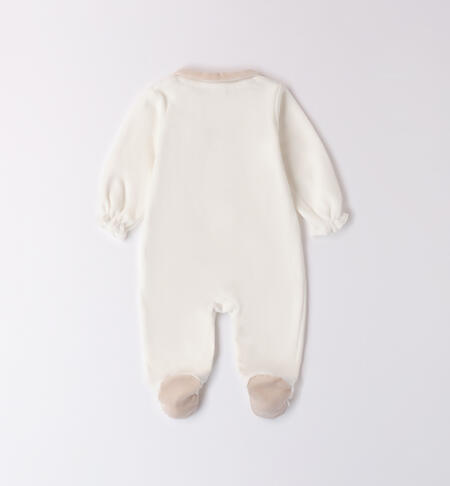 Tutina per neonata iDO 0-18 mesi in ciniglia. Il modello presenta apertura frontale e nel sottogamba con bottoni a pressione per agevolare il cambio e la vestizione. La tutina รจ realizzata in tinta unita con dettagli a contrasto.