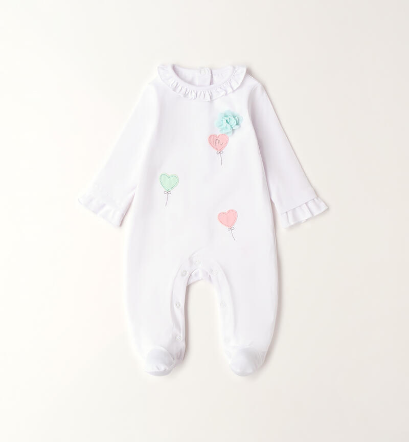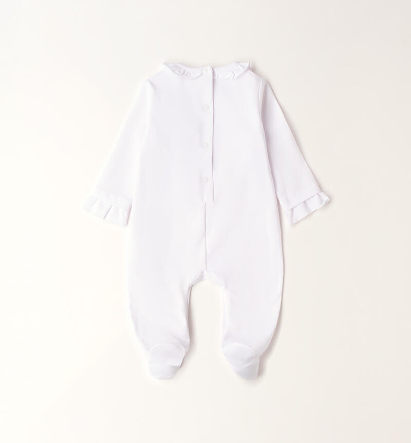 Tutina intera con piede per neonata Minibanda realizzata in jerset stretch di cotone con apertura sul retro e nel sottogamba con bottoni a pressione per agevolare il cambio e la vestizione. La tutina รจ arricchita da ruches, ricami e applicazioni ricamo.
