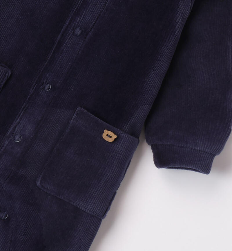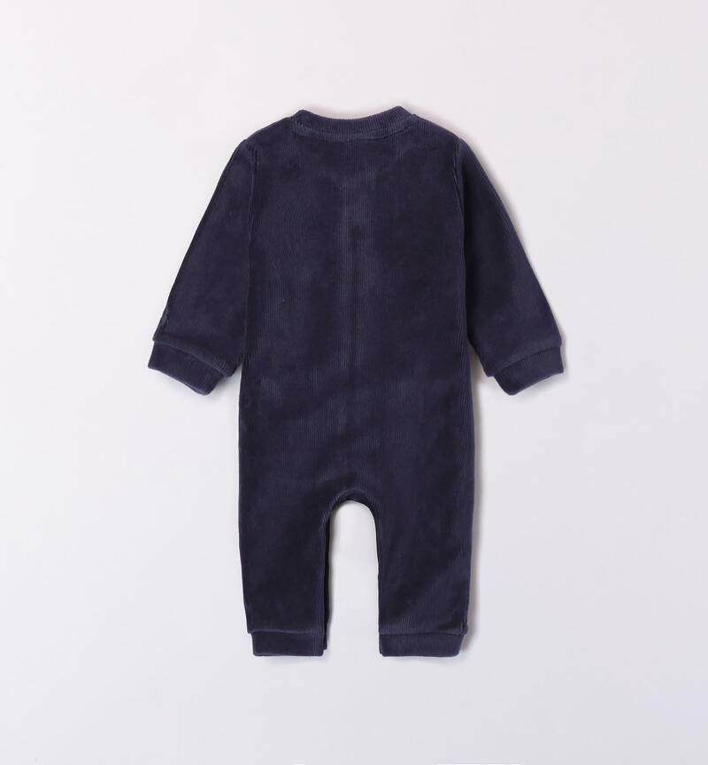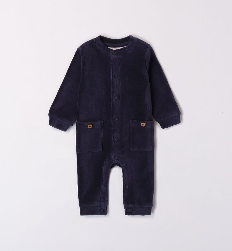 Tutina intera blu per neonato realizzata in ciniglia effetto velluto con apertura davanti e nell’interno cosce tramite bottoni snap per agevolare la vestibilitร . Modello con tasche