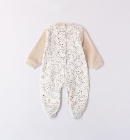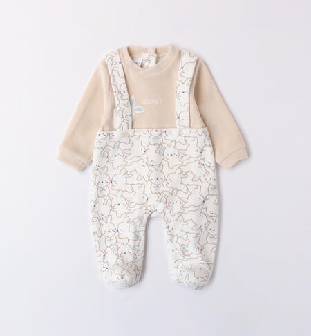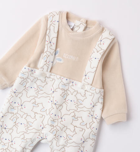 Tutina per neonato iDO 0-18 mesi in ciniglia. Il modello presenta apertura sul retro e nel sottogamba con bottoni a pressione per agevolare il cambio e la vestizione. La tutina ha maglietta tinta unita e finta salopette in fantasia allover.