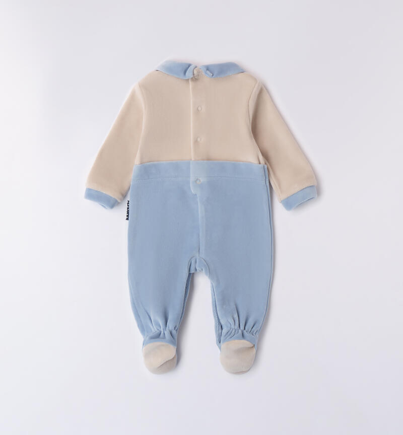 Tutina neonato Minibanda 0-18 mesi realizzata in ciniglia. Il modello presenta apertura sul retro e nel sottogamba con bottoni a pressione per agevolare il cambio e la vestizione. La tutina รจ bicolor con ricamo frontale.