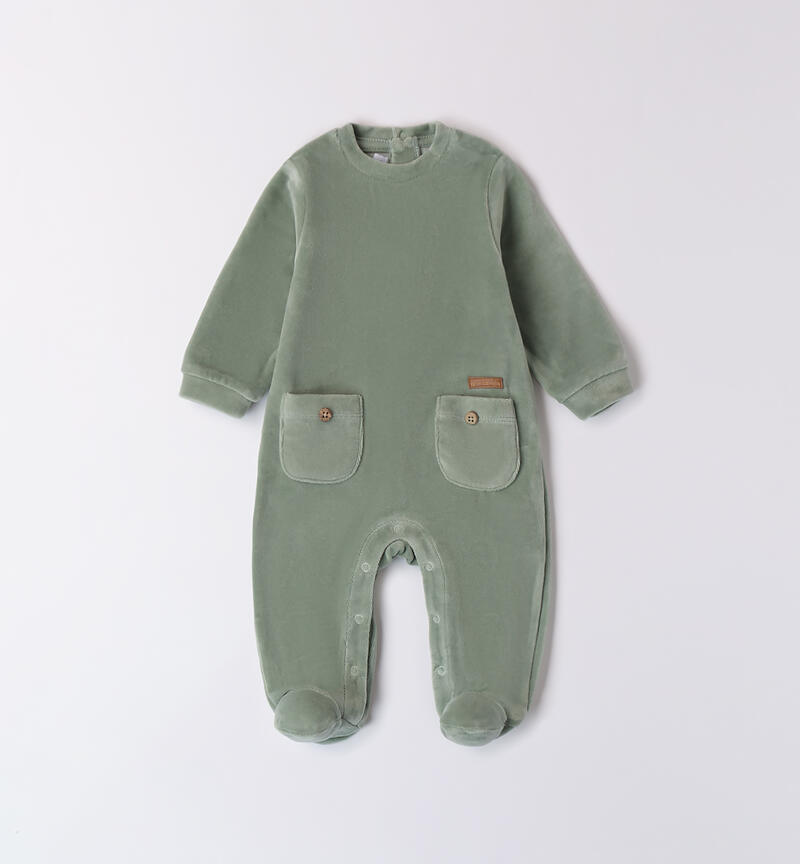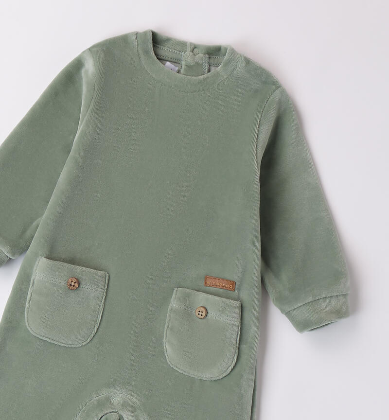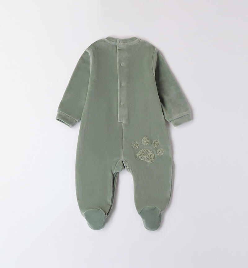 Tutina neonato Minibanda 0-18 mesi realizzata in ciniglia. Il modello presenta apertura sul retro e nel sottogamba con bottoni a pressione per agevolare il cambio e la vestizione. La tutina รจ realizzata in fantasia tinta unita con tasche frontali e ricamo spugna a zampetta nella parte dietro.