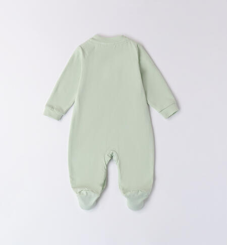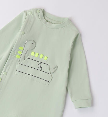 Tutina intera con piede per neonato iDO 0-18 mesi in jersey di cotone elesticizzato. L’articolo ha l’apertura dalla spalla al piedino con bottoni a pressione per facilitare la vestizione. Taschino davanti, dettagli fluo e tema dinosauro
