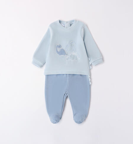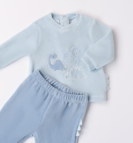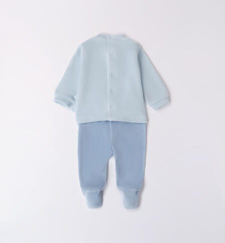 Tutina per neonato iDO 0-12 mesi in ciniglia. La maglietta presenta apertura sul retro con bottoni a pressione per agevolare il cambio e la vestizione. La ghettina รจ in tinta unita. Il modello รจ arricchito da simpatica cresta in applicazione.