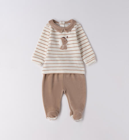 Tutina due pezzi con piede per neonato iDO in ciniglia. L’articolo presenta l’apertura sul retro con bottoni a pressione per agevolare il cambio e la vestizione, fantasia a righe. I pantaloni hanno l’elastico in vita, fantasia tinta unita.