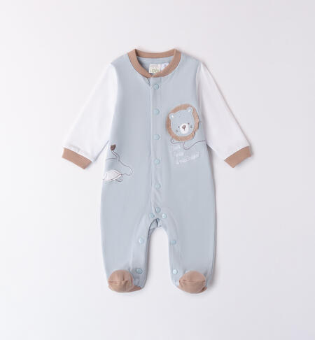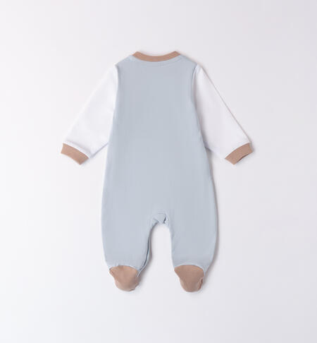 Tutina neonato 0-18 mesi iDO in jersey stretch di cotone. Il modello presenta apertura frontale e nel sottogamba con bottoni a pressione per agevolare il cambio e la vestizione, fantasia tinta unita bicolor con colletto, piedini e fondo maniche a contrasto.